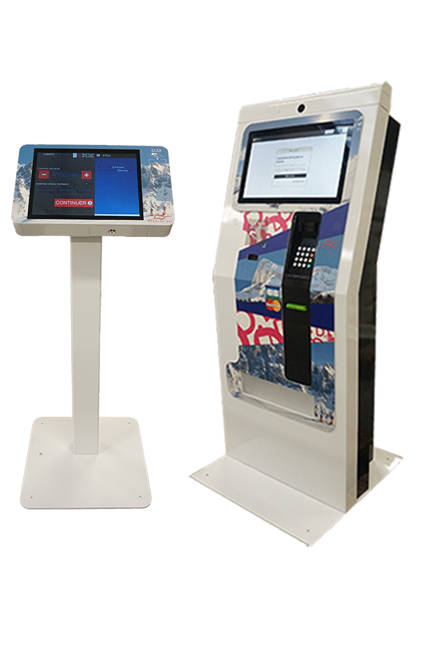 Estos terminales táctiles permiten a los esquiadores retirar, recargar y pagar sus forfaits de esquí directamente en el terminal, en cuestión de segundos. El pago se realiza de forma segura gracias al kiosco de pago integrado en el terminal.