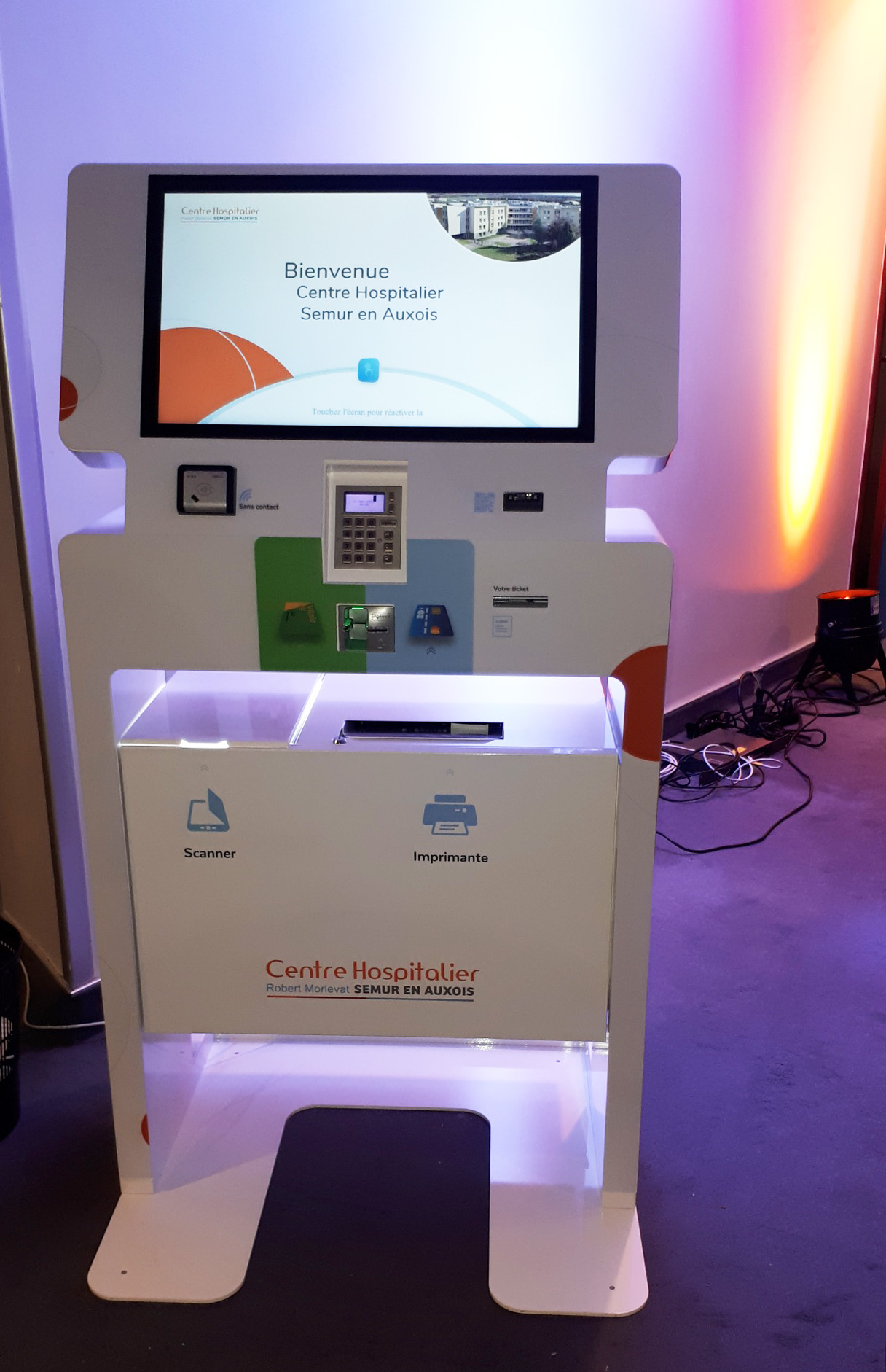 Équipées d'un lecteur de carte SESAM-Vitale, d'un terminal de paiement, d'une imprimante A4 et/ou tickets et d'un scanner A4, ces bornes tactiles permettent notamment d'accueillir et d'orienter les patients, de valider leur dossier de pré-admission et payer leur reste à charge.